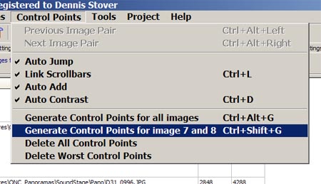 From the menu, select Control Points -> Generate control points for images 7 and 8 (or whatever image numbers you have)