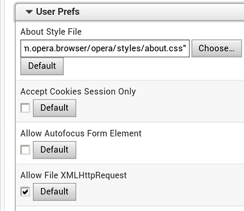 Scroll down until you find "User Prefs". Expand User Prefs and place a check mark in the box next to "Allow File SMLHttpRequest"